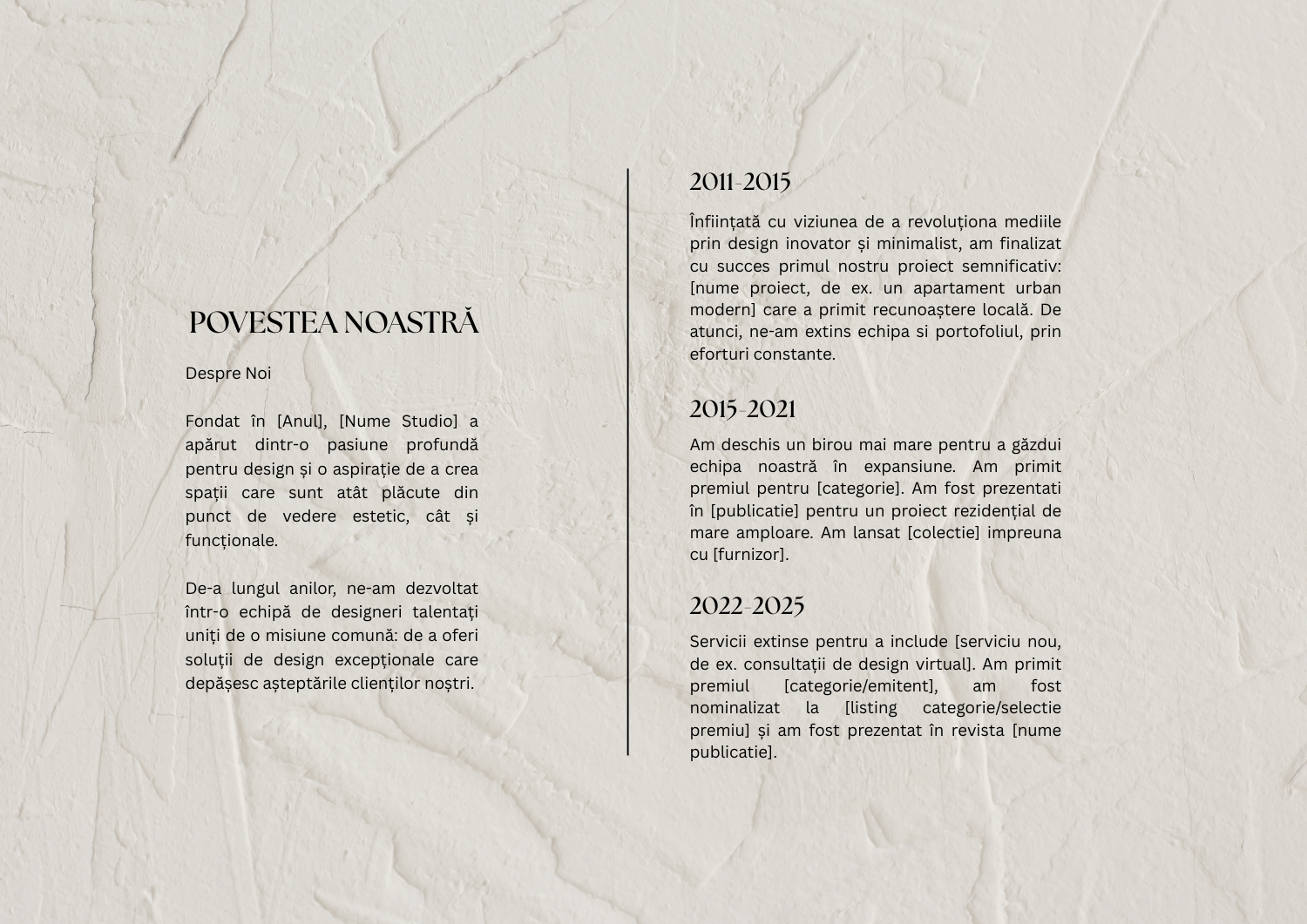 secțiuni clare pentru: despre tine, valori, proces de lucru, testimoniale, stiluri, studii de caz